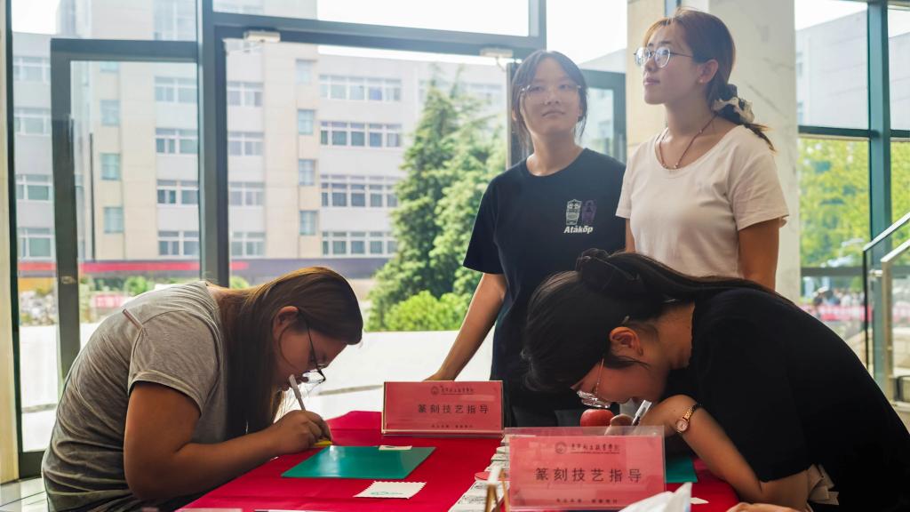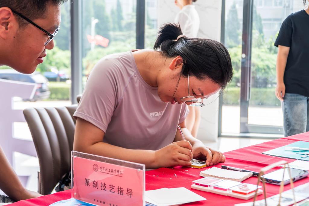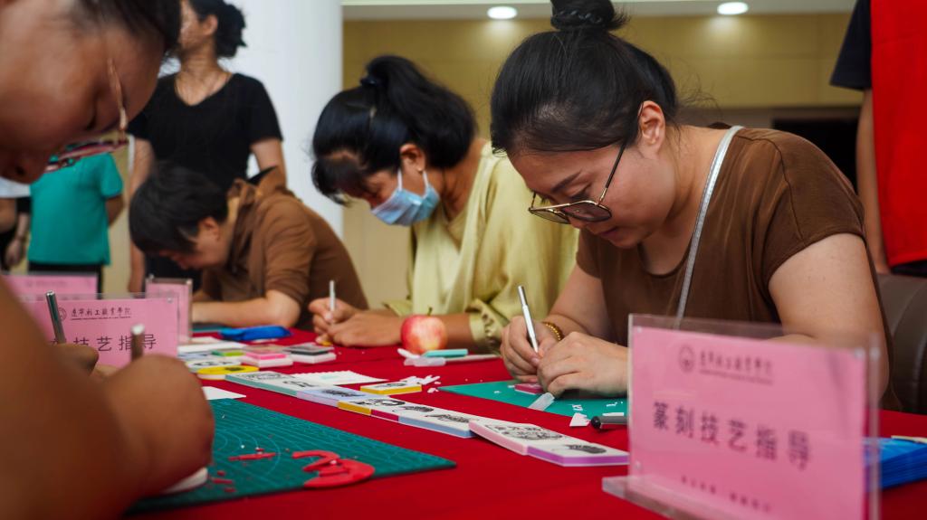 活动现场,篆刻技艺指导详细介绍非遗技艺,获得了领导们的高度称赞。工作人员为每位教职员工精心准备了篆刻工具和材料,现场教授篆刻技巧的专业师生,耐心细致地讲解与示范如何执刀、运刀,如何设计章法、布局,老师们全神贯注投入到篆刻创作中,精心设计图案和文字。在专业老师的指导下,一枚枚精美的藏书章生动呈现,让大家零距离感受到篆刻技艺的非凡魅力。